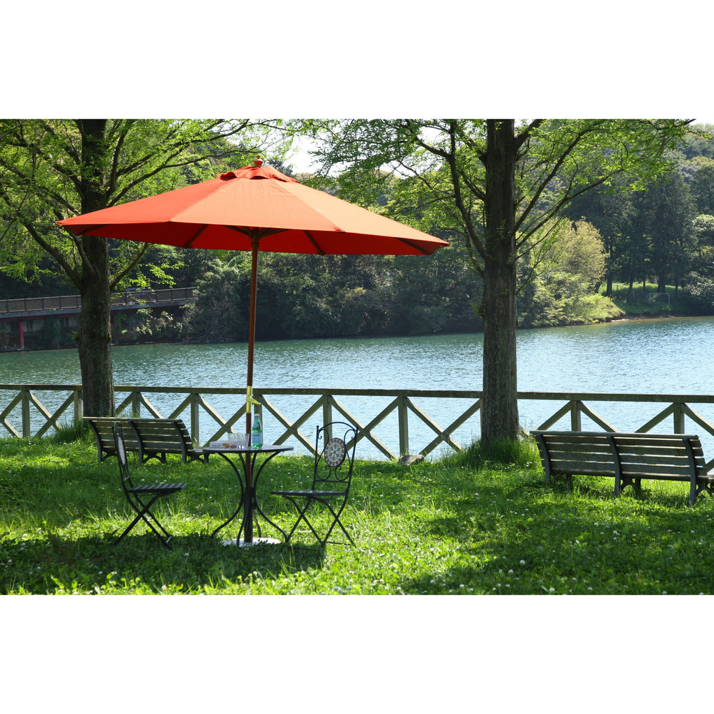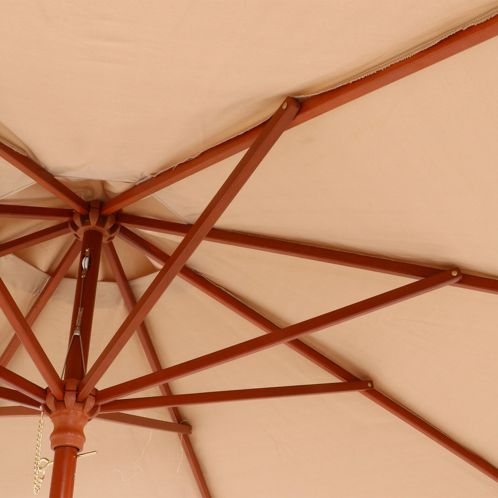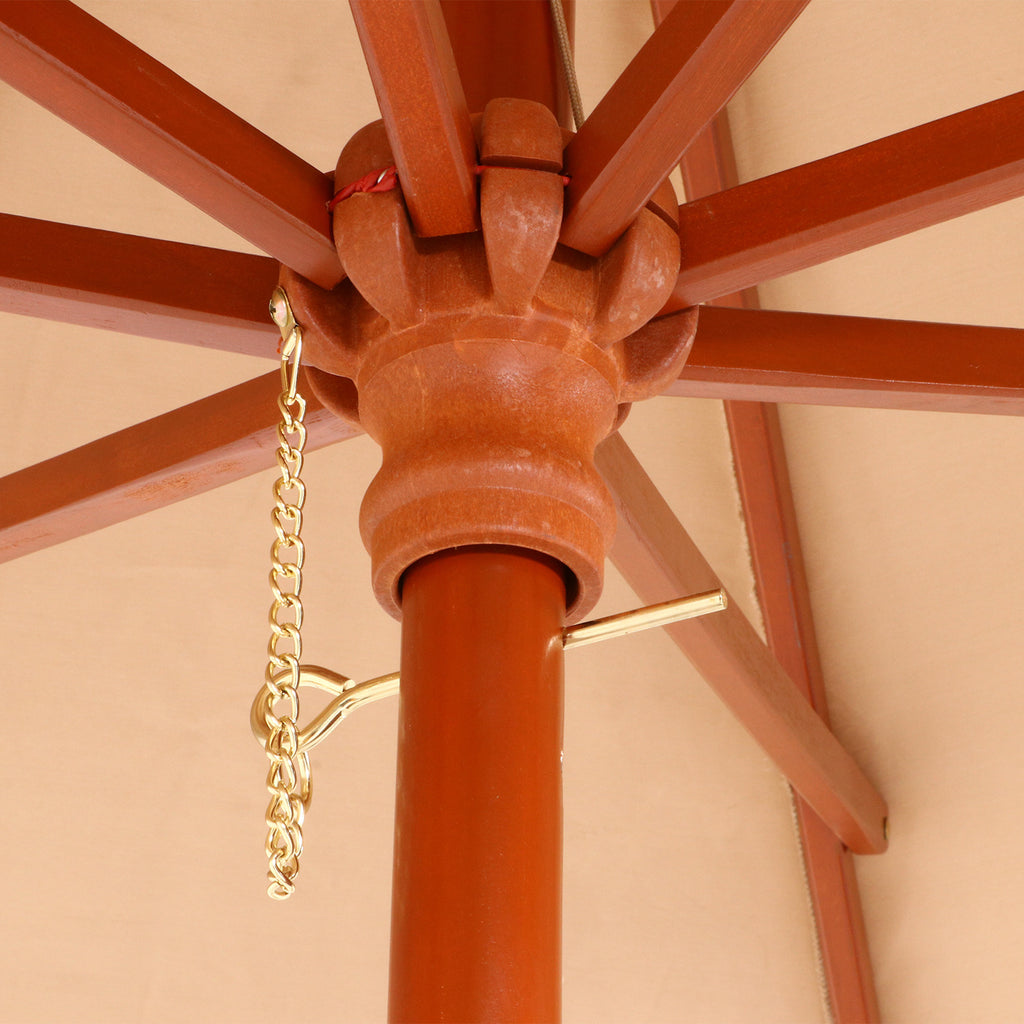 天然木の支柱を採用した温かみのあるデザインのガーデンパラソルで、クランク式による簡単操作と高いUVカット性能を兼ね備えた商品です。