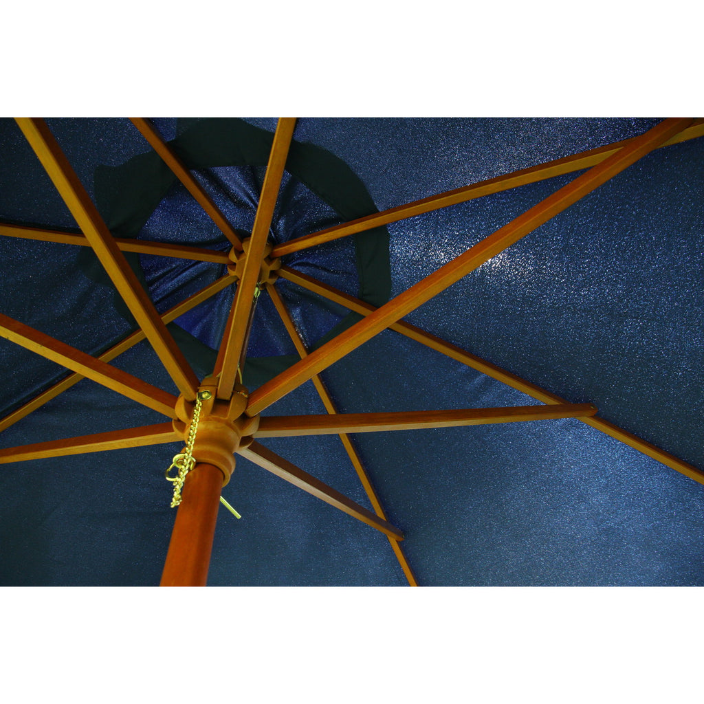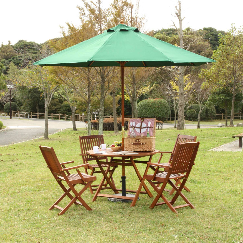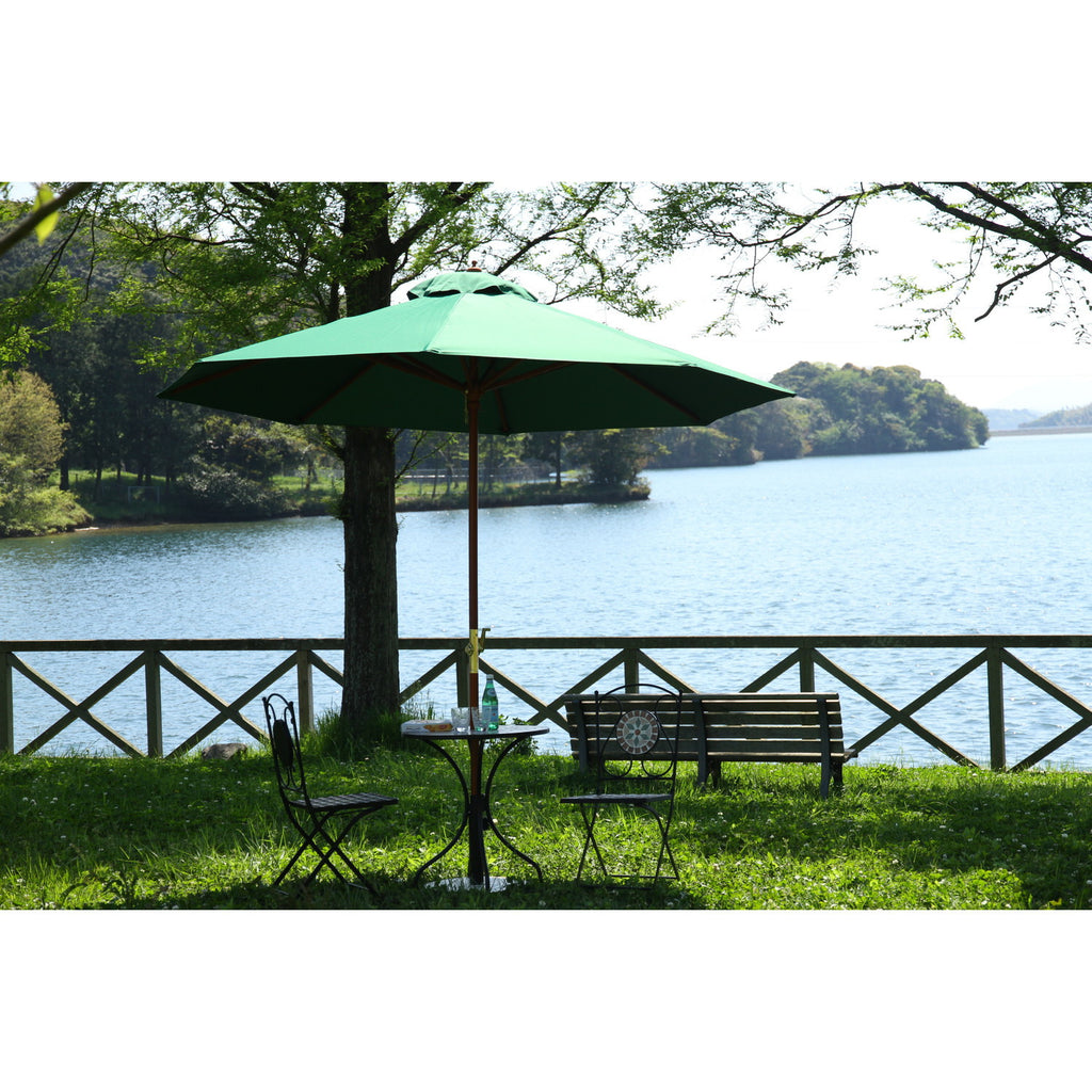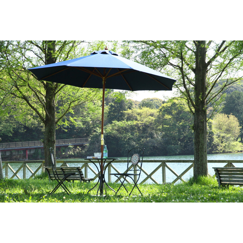 天然木の支柱を採用した温かみのあるデザインのガーデンパラソルで、クランク式による簡単操作と高いUVカット性能を兼ね備えた商品です。