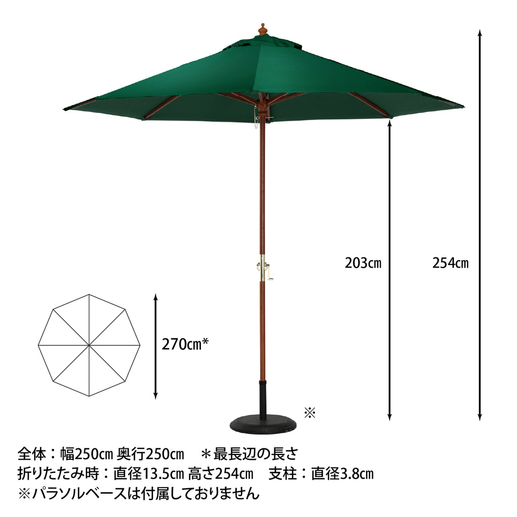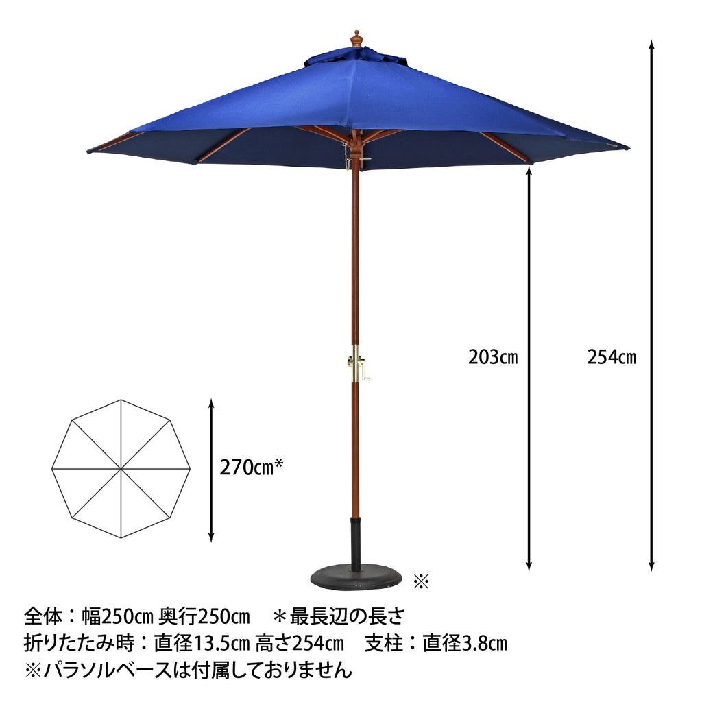 | 商品サイズ | 全体:W2500×D2500×H2540mm 親骨の長さ:1420mm 展開時最長辺サイズ:約2700mm 支柱径:φ38mm |