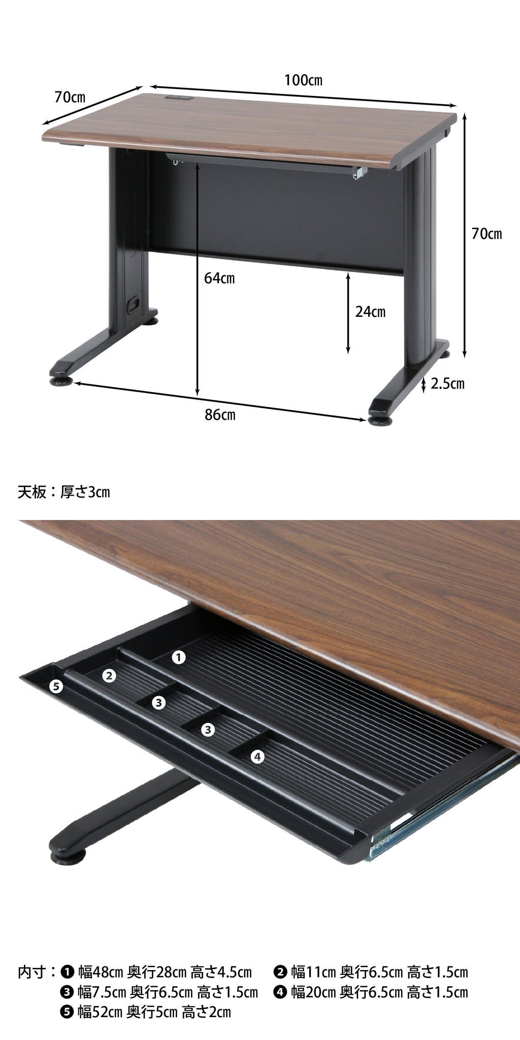 幅100cmのコンパクト設計のため、限られたスペースにも設置しやすく、小規模オフィスや自宅のワークスペースにも適しています。パソコン作業や書類作業に十分なスペースを確保しており、日常業務を快適に行えます。