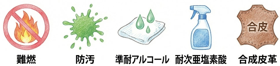 | ◆仕様 張地:合成皮革 張地機能:防汚・耐次亜塩素酸・難燃・準耐アルコール クッション材:チップウレタン ◆付属品:滑り止め付連結シート 4枚 |